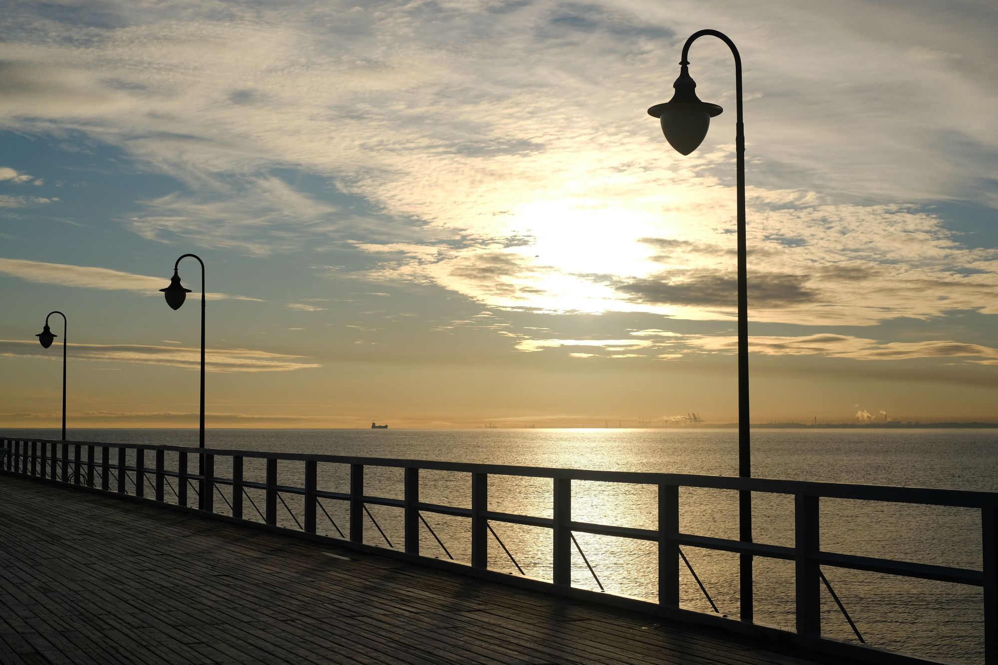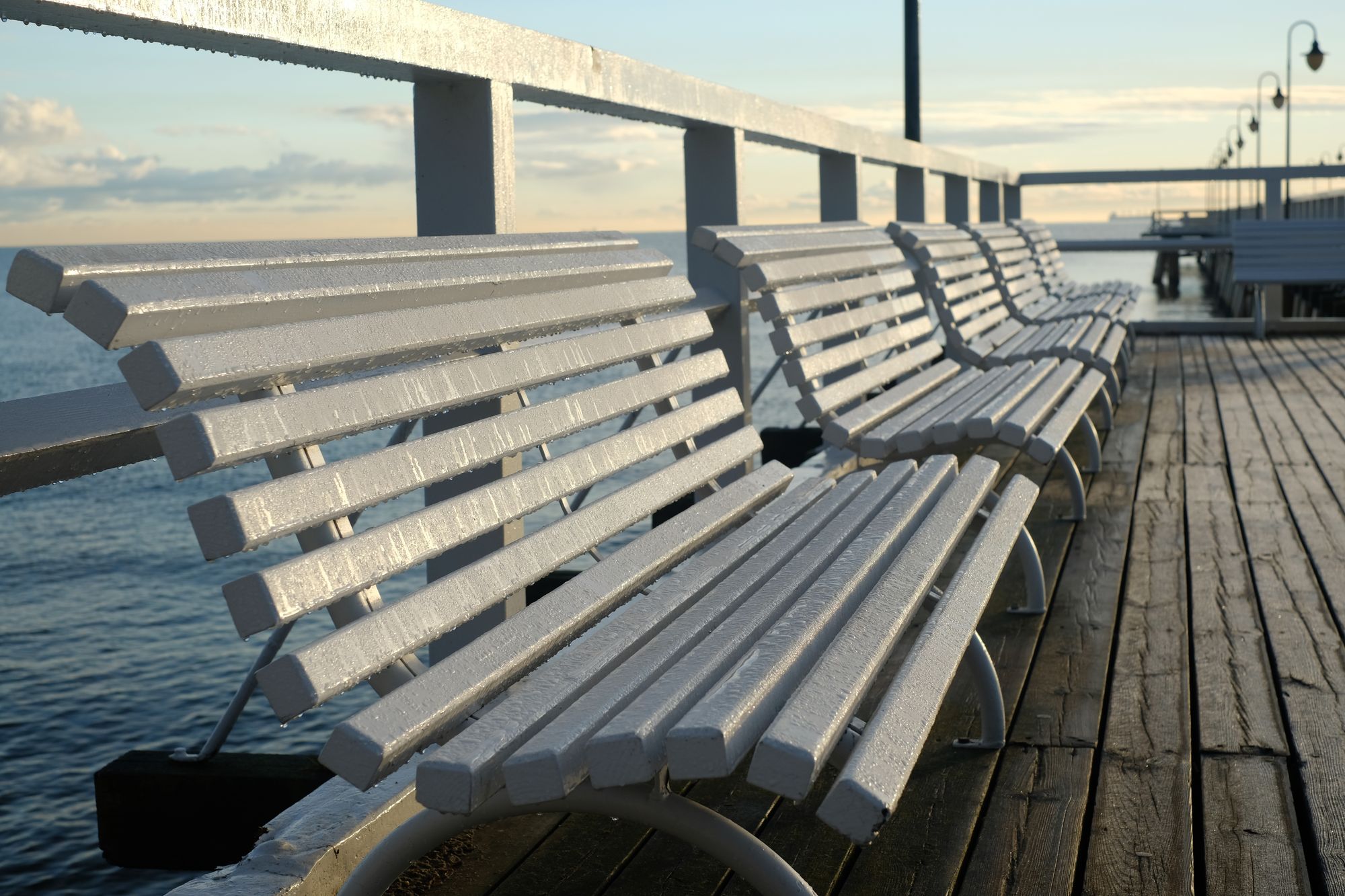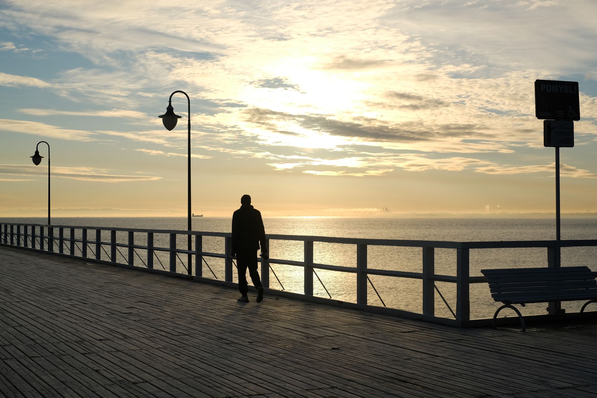 A morze dziś wyglądało zjawiskowo. Poszczęściło również światłem. Poranek był mroźny, molo pokryte warstwą szronu, niebo z fikuśnym zaczesem z chmur. Ludzi, prawie brak. Na plaży tylko mewy. Miło.