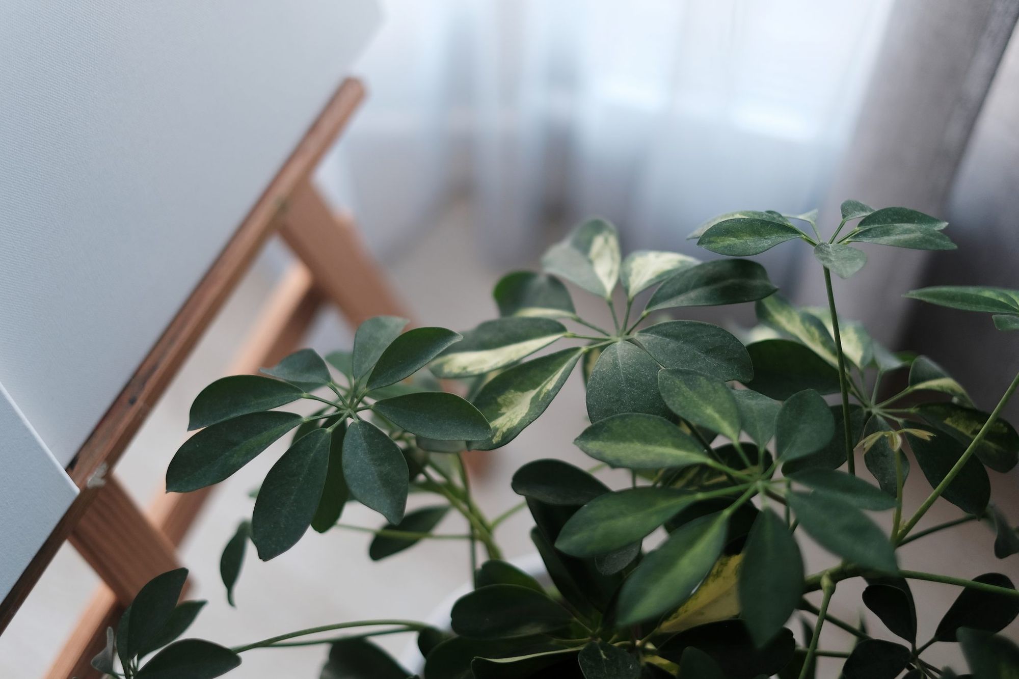 Ot tak pstryknięty kwiatek, kawałek sztalugi z płótnem, firanka z zasłonką na dalszym planie. Zwykła zwykłość, a jakoś tak cieszy oko.